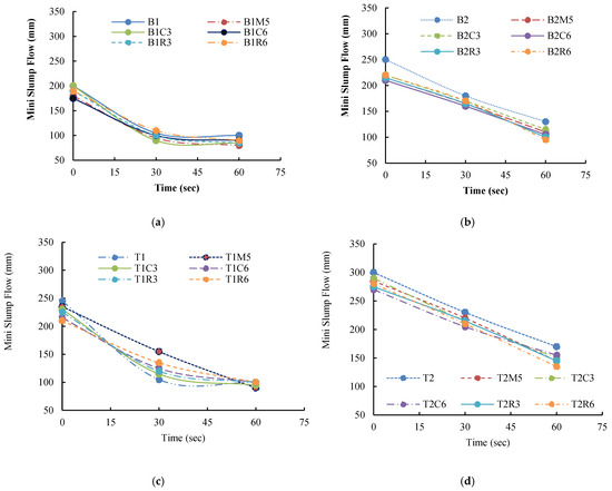 Mini-slump flow vs. time of AAMs (a) B1, (b) B2, (c) T1, and (d) T2.