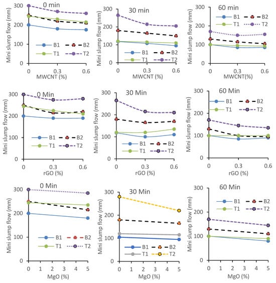 Figure 13 shows the variation in the measured mini-slump flow with time (0 min, 30 min, and 60 min after mixing). All the mixes showed a similar trend of a decrease in the mini-slump values with the increase in the elapsed time, as expected. The ternary mixes (T) exhibited a higher slump flow than their binary counterparts (B) due to the presence of FA-F with round particles. Also, mixes (both binary and ternary) with reagent 2 (B2 or T2) showed a higher slump flow than their reagent 1 counterparts (B1 or T1) for reasons discussed in connection with the viscosity. The mini-slump flow generally decreased with an increase in the MWCNT content whereas the MWCNT mixes showed less slump flow compared to their rGO-incorporated counterparts. In general, the addition of MgO and MWCNT in the control AAMs resulted in a decrease in the slump flow. All the AAMs exhibited a satisfactory initial slump flow (at 0 min), ranging between 175 mm and 300 mm (Table 3 and Figure 13), and showed their potential to retain and regain their workability with time as observed from their shear-thinning or pseudoplastic behavior. However, more investigations are needed to optimize the dosages and combinations of reagent types and nanomaterials.