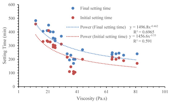 Figure 15 shows the relation showing the general trend between the measured mini-slump flow and viscosity values at 0 min, 30 min, and 60 min after mixing. The non-linear relationship indicates that a mix with higher viscosity will yield a lower slump flow diameter. This is because of the presence of high in-particle friction/bond resulting from the particle shape, water absorption, and surface area in highly viscous mixes. This particular trend of a decrease in the slump flow with an increase in the viscosity can be observed in Figure 14 where there are correlation coefficient (R2) values of 0.7795, 0.6716, and 0.5466, respectively, for 0 min, 30 min, and 60 min. However, the correlation coefficient seemed to decrease with the increase in the elapsed time. Figure 16 also shows a non-linear relationship, indicating a decrease in both setting times (initial or final) with an increase in the viscosity of AAMs incorporating MgO, MWCNT, and rGO.