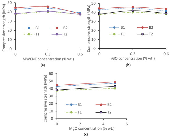 - The 28-day compressive strength of the AAMs ranged from 37 MPa to 49 MPa. The addition of 5% MgO increased the compressive strength by 8 to 13%, while the use of WCNT/rGO showed an increasing trend up to 0.3% and a decrease at a higher dosage (0.6%).