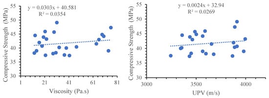 - Reasonable relations are found between the compressive strength, viscosity, and UPV, as well as the viscosity, slump flow, and setting time. The relation of the viscosity with the yield stress validates the fact that higher shear forces are required for highly viscous material required to induce inter-particle movements. Similarly, the variation in the viscosity against the slump flow showed inverse and good relations at 0 min, 30 min, and 60 min with R2 values of 0.812, 0.748, and 0.735, respectively.