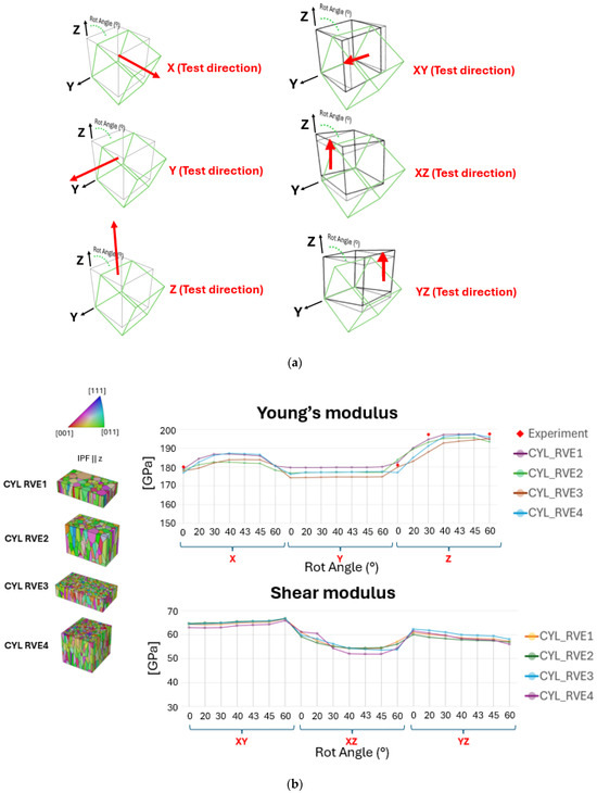 The Young’s modulus values obtained through virtual testing using various representation methods for the CYL sample, as shown in Figure 12b, indicate that grain morphology, such as shapes and sizes, has minimal influence. Instead, grain count and texture are the primary factors contributing to result variations. With an increased grain count, CYL RVE4 approaches the most representative case, CYL RVE1, even though CYL RVE4 does not account for the representativeness of grain size distributions, relying instead on the automatic grain size distribution generated by NEPER.