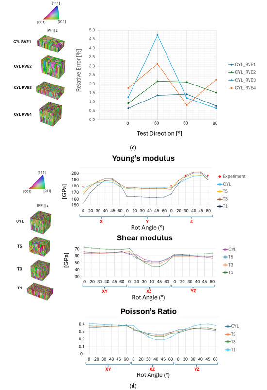 Figure 12b shows that the RVE1 method, considered the most representative, closely matches the experimental data, suggesting its high potential for accurately predicting material properties. However, despite this strong correlation, the RVE1 method demonstrated significant instability during the tessellation process, making it difficult to apply to other samples. This method requires precise grain morphological inputs, such as grain centroid coordinates, grain sizes, mean grain orientations, and aspect ratios. Given that only a single EBSD plane was considered in this work, it was challenging for NEPER to convert the 2D data into a 3D RVE using this method. As a result, it involved extensive tessellation times and a high risk of mesh generation failures, which limited its practical use. In contrast, the RVE4 method, which involved a broader selection of the EBSD area, showed comparable results to RVE1, with correlation errors of 1.8%, 3.2%, 0.8%, and 2.2% at 0°, 30°, 60°, and 90° test directions, respectively, seen in Figure 12c. Error quantification was calculated using following relative error Equation (notation ‘YM’ corresponds to Young’s Modulus):