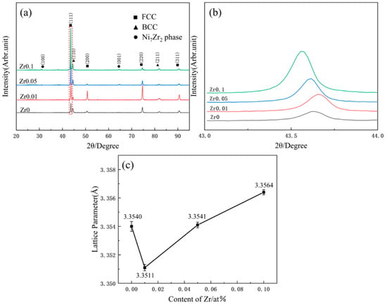 Figure 1 presents the XRD patterns of the as-cast ZrxAlCoCrFeNi2.1 (x = 0, 0.01, 0.05, 0.1) high-entropy alloys, along with the diffraction peaks of the (111) crystal plane. The results reveal that for x = 0, the alloy displays an FCC + B2 dual-phase structure (see Figure 1a). At x = 0.01, no new diffraction peaks appeared, while increasing the Zr content to x = 0.05 and x = 0.1 introduced new peaks at 2θ = 35.88° (100) and 2θ = 64.82° (001), which were previously reported by Wang et al. [15] and Li et al. [16], identifying Ni7Zr2. This peak, tentatively attributed to the Ni7Zr2 phase based on PDF card comparisons, required TEM verification to confirm its exact structure. Further analysis showed that the intensity of the diffraction peaks varied with the Zr content. Figure 1b shows that with the addition of Zr, the intensity of the (111) plane diffraction peaks gradually increased. Moreover, Figure 1c shows that the lattice parameters initially decreased, resulting in the diffraction peaks shifting to higher angles (to the right). As the Zr content increased further, the lattice constant also increased, causing the peak positions to shift leftward (toward higher angles). This shift is likely due to minor lattice changes in the solid-solution phase of the original AlCoCrFeNi2.1 high-entropy alloy with the addition of small amounts of Zr, similar to the influence of Nb on AlFeCrCoNi high-entropy alloys [17]. When Zr reached a certain level, new diffraction peaks appeared, indicating the gradual precipitation of Zr compounds from the B2 structure in the solid-solution phase. This precipitation increased the proportion of the precipitated phase while reducing the proportion of the B2 phase. Concurrently, Zr atoms were present in the FCC matrix as an interstitial solid solution, progressively strengthening the (111) crystal plane diffraction peaks. With further Zr addition, zirconium compounds precipitated more, leading to a noticeable shift in the diffraction peaks to larger angles.
