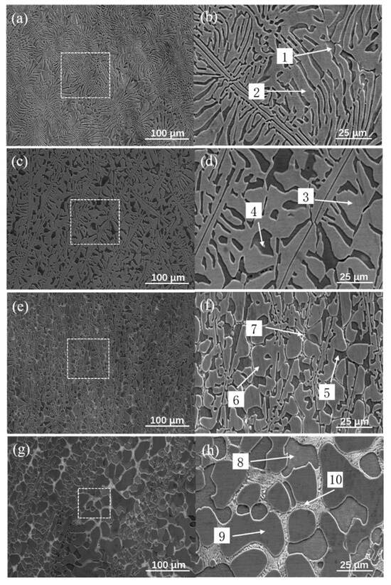 SEM images of as-cast ZrxAlCoCrFeNi2.1 alloys: (a,b) x = 0; (c,d) x = 0.01; (e,f) x = 0.05; (g,h) x = 0.1.