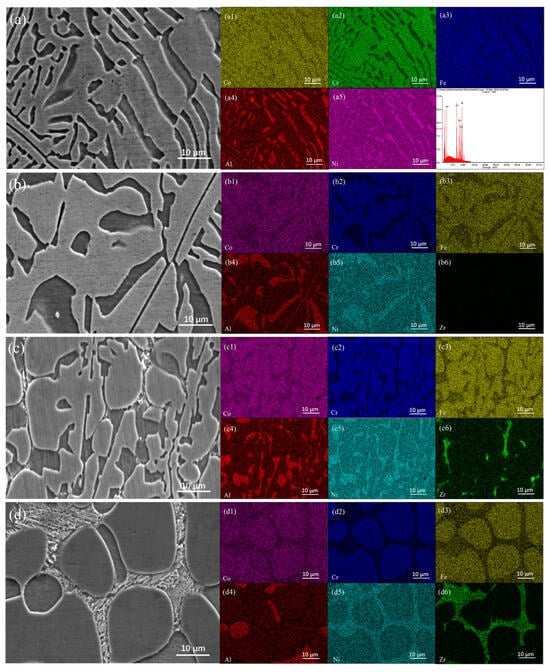 EDS mapping of as-cast ZrxAlCoCrFeNi2.1 alloys: (a) x = 0; (b) x = 0.01; (c) x = 0.05; (d) x = 0.1.