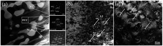 The high-resolution microstructure of the Zr0.1 alloy was analyzed using transmission electron microscopy (TEM). Figure 3 presents bright-field images of various regions in the Zr0.1 alloy, along with the associated selected-area electron diffraction patterns (SAEDs). In particular, the SAED pattern shown in Figure 4a reveals that the black region in the Zr0.1 alloy corresponds to the FCC phase, the white region is associated with the B2 phase, and the gray region represents the Ni7Zr2 phase, which is consistent with prior findings. In addition, the SAED pattern of the FCC phase shows faint diffraction spots in addition to the main FCC diffraction spots. These extra spots arose from the superlattice of the L12 face-centered cubic ordered phase. Similar electron diffraction patterns for the FCC phase, which confirm that the black region is indeed the L12 phase, were reported previously [23,24]. In this study, a supplementary super-diffraction spot from the FCC phase, indicated by a white circle, was chosen, and a dark-field image was acquired from this phase, as illustrated in Figure 4b. Spherical or ellipsoidal L12 precipitates were dispersed within the FCC phase. Figure 4c shows a high-resolution bright-field image of the B2 phase, which reveals the presence of spherical nanoprecipitates. It is inferred that the addition of Zr encourages the formation of the Ni7Zr2 phase in the AlCoCrFeNi2.1 alloy and may also promote the precipitation of the L12 ordered phase within the FCC phase. The nanoprecipitates in both the L12 and B2 phases contribute to improved material performance by forming coherent or semi-coherent interfaces with the matrix phase. Nevertheless, excessive Zr segregation can result in embrittlement, particularly with the development of a continuous network of Zr-rich phases and zirconides. Therefore, optimizing alloy performance requires balancing the strengthening effects of these phases with the potential drawbacks of phase segregation. Further research on the mechanical properties will provide deeper insights into the performance variations with different Zr contents.