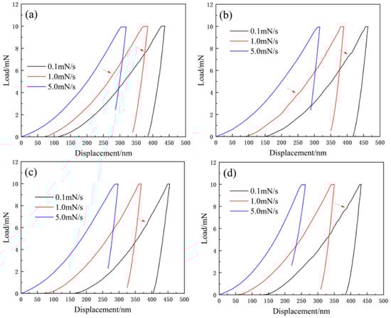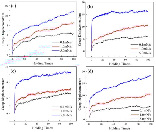 The FCC phase constitutes 70% of the original alloy and is the dominant crystalline phase [25], thereby exerting a more substantial influence on the 25 overall properties of the alloy. Analyzing the creep behavior of this primary phase can yield valuable insights into the comprehensive creep performance of the alloy. Nanoindentation techniques were used to examine the effects of grain boundaries, maximum load, and loading rate on the nano-creep behavior. As shown in Figure 5a–d, horizontal shifts were applied to the figures to differentiate between the curves. The experimental results revealed that, during the loading phase, the P-h curves at different loading rates were parallel, supporting the reliability of the data. In the holding stage, where the load remained constant, the displacement gradually increased, signifying creep behavior. After unloading, a minimal elastic recovery was observed, indicating that the alloy experienced permanent deformation. Comparing the maximum displacements of alloys with varying Zr content at an identical loading rate (e.g., 0.1 mN/s), the maximum displacements were measured as 270, 263, 241, and 247 nm, respectively. The maximum displacement of the alloys decreased with increasing Zr content. A similar trend was evident at loading rates of 1 and 5 mN/s, where the maximum displacement across all four alloys decreased as the loading rate increased. As indicated by the arrows in Figure 5a–d, a pop-in phenomenon appears in the P-h curves during the loading phase at a loading rate of 0.1 mN/s. This behavior reflects the response of the alloy to dislocation nucleation, with the nucleation sources typically being pre-existing dislocations or vacancies [26,27]. Notably, in comparison with the 1 mN/s loading rate, the pop-in points occur earlier and more frequently at a 0.1 mN/s loading rate. This is because, at lower loading rates, dislocations have ample time to nucleate and propagate, while the strain gradient is lower, facilitating dislocation slip [28]. As a result, the pop-in phenomenon occurs sooner and with a greater frequency.