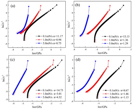 In this equation, the strain rate is represented as , and the strain force is represented as , Pmax is the peak load, and c is the hardness indenter coefficient. For the Berkovich indenter, the value of c was 24.56 [33]. Similar to conventional alloys, the creep rate follows a power-law relationship with stress, and the creep stress exponent n is calculated using Equation (4) [34]:
