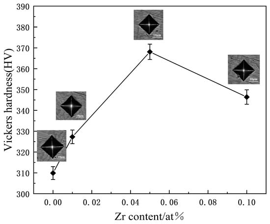 Figure 8 illustrates the average hardness and corresponding indentation morphology of the as-cast ZrxAlCoCrFeNi2.1 high-entropy alloys. The data revealed a notable trend: As the Zr content increased, the hardness initially increased before subsequently declining. Specifically, at a Zr content of x = 0.05, the hardness reached its peak value of 368.1 HV. This increase in hardness can be attributed to the effects of Zr, which leads to lattice distortion and enhanced solid-solution strengthening. In addition, the appropriate addition of Zr promotes the precipitation of fine Zr-based compounds (such as Ni7Zr2), which can effectively enhance the strength of the matrix [39]. Further analysis using XRD and EDS indicated that with the addition of Zr, some of the Zr reacted with Ni in the B2 phase to form the Ni7Zr2 phase. This phase contributed to the hardness of the alloy through precipitation strengthening, reinforcing the positive impact of Zr on the mechanical properties. However, as the Zr content further increased to x = 0.1, a significant change in the phase structure of the alloy occurred, as depicted in Figure 2b,h. The structure transitions from lamellar configuration to petal-like morphology. This transformation results in coarsening of the Ni7Zr2 phase, which has detrimental effects on the properties of the material. Coarsening not only weakens the grain boundaries but also depletes essential strengthening elements, such as Ni and Al, from the matrix, as shown in Figure 2d. Consequently, this reduction in the solid-solution and precipitation strengthening led to a decrease in the hardness [40]. In summary, while the initial addition of Zr enhances the hardness of the alloy through mechanisms such as solid-solution strengthening and precipitation hardening, especially when the Zr content is at x = 0.05, the hardness of the alloy reaches a maximum value of 368.1 HV. Excessive Zr content ultimately disrupts the microstructural integrity and reduces hardness owing to phase coarsening and depletion of critical alloying elements. This highlights the importance of optimizing the Zr content to achieve the desired mechanical properties in high-entropy alloys.