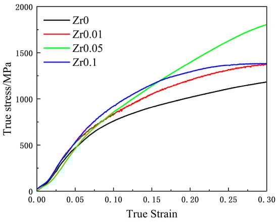 (3) With the increase in Zr content, the compressive strength, yield strength, and hardness of the alloy show an overall upward trend, reaching a maximum at x = 0.05. At this point, the yield strength increases by approximately 48.7% to 1048.7 MPa, the compressive strength increases by approximately 52.2% to 1801.1 MPa, and the hardness increases by approximately 18.7% to 368.1 HV. The synergistic effect of solid-solution strengthening by Zr atoms and precipitation strengthening by hard zirconium compounds is highlighted.