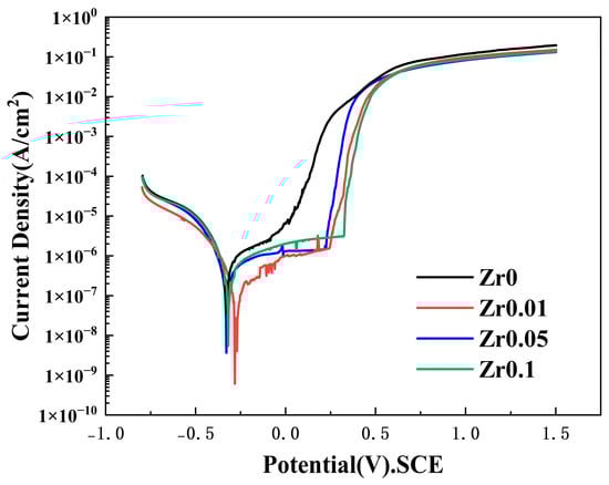 (4) In the high-entropy alloy AlCoCrFeNi2.1 (x = 0, 0.01, 0.05, 0.1), when x = 0.1, the alloy exhibits the lowest self-corrosion current density of 0.034197 μA/cm2, with a corrosion potential of 277.55 mV, indicating optimal corrosion resistance. This is primarily due to the amount and uniformity of the Ni7Zr2 precipitates in the alloy, which are key factors affecting the corrosion resistance of the ZrxAlCoCrFeNi2.1 high-entropy alloy. At a Zr content of x = 0.1, Ni7Zr2 can achieve a uniform distribution, forming a dense protective layer and oxide film, thereby enhancing the overall corrosion resistance of the alloy.