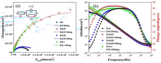 EIS images of the ZrxAlCoCrFeNi2.1 high entropy alloy in 3.5 wt% NaCl solution: (a) Nyquist plot and equivalent circuit diagram; (b) Bode plot.