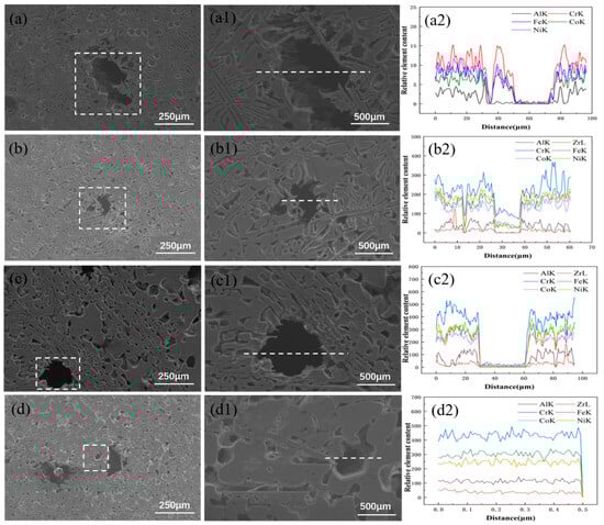 The surface pit morphology (in the boxes) and EDS line scan images (with the lines indicating the scan length) of the ZrxAlCoCrFeNi2.1 high entropy alloy after corrosion in 3.5 wt% NaCl solution: (a,a1,a2) x = 0; (b,b1,b2) x = 0.01; (c,c1,c2) x = 0.05; (d,d1,d2) x = 0.1.