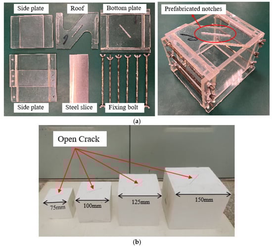 Cubic gypsum specimens were prepared for the tests. This material has similar structural and failure characteristics to rocks and is characterized by stable mechanical properties, easy fabrication, and low cost, so it is commonly used in the study of rock-like materials [52,53]. As shown in Figure 1a, the preparation device for gypsum specimens with open cracks consists of a bottom plate, side plates, a top plate (roof), fixing bolts, and a steel sheet. Among them, the fixing bolts and the steel sheet are metal, and the other parts are tempered glass. The steel sheet is 1 mm thick. The test materials were desulfurized gypsum powder and laboratory tap water. Briefly, the gypsum powder and water were evenly mixed according to a mass ratio of 1:1 and poured into the assembled cubic gypsum specimen preparation device. After curing at 20 °C ± 2 °C for 1 h to 2 h, the steel sheet wiped with engine oil was inserted into the specimen through the prefabricated slit on the top plate. All specimens were demolded after 24 h, and the steel sheet was removed from the specimen. The crack penetration was checked to ensure successful open crack prefabrication in the center. The prepared specimens were transferred into a curing box to cure for 28 days at 20 °C ± 2 °C according to the standard curing method. After curing, the specimen surface was ground to reduce the impact of friction while facilitating observation of the whole crack initiation and expansion process in the subsequent uniaxial compression tests. Figure 1b shows four open crack gypsum specimens of different sizes after polishing.