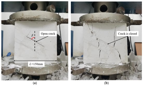 Uniaxial compression tests were conducted using an electro-hydraulic servo control device with a maximum load capacity of 500 kN. Vaseline was applied to the plates to minimize friction before loading. The system applied displacement-controlled loading at a rate of 0.8 mm/min until specimen failure occurred, with vertical displacement and load data automatically recorded by the supporting software, while a high-speed camera captured the full crack initiation and propagation process. Figure 2 shows a gypsum specimen with an open crack, measuring L = 150 mm and a prefabricated crack inclination of β = 60° under uniaxial compression testing. In Figure 2a, significant crack propagation was observed at both ends of the prefabricated crack during the early loading stages, with smooth, parallel propagation paths. With continued loading, the open crack gradually closed. Figure 2b shows the specimen at final failure, where the crack had propagated through the entire specimen, and the prefabricated crack appeared closed.