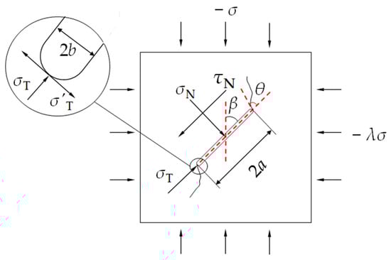 To better analyze the stress state of the crack on the lateral surface of the specimen as shown in Figure 2a, within the framework of traditional fracture mechanics theory and based on linear elasticity, a model of a central open inclined crack under biaxial compression conditions was developed, as illustrated in Figure 3. The crack length is 2a, thickness is 2b, and the prefabricated crack inclination (β) is defined as the angle between the crack and vertical direction. The crack was subjected to far-field stresses, with the principal stress (−) and lateral stress (−λσ) acting on the crack where tensile stress is defined as positive and compressive stress as negative. is the normal stress perpendicular to the prefabricated crack, is the shear stress parallel to the prefabricated crack, and is the tangential stress when the crack is open. The parameter λ is the lateral compression coefficient [54,55]. At the crack tip, the strain in the thickness direction is sufficiently constrained, allowing the crack tip region to be approximated as a plane strain state. This model primarily analyzes the stress field on the surface of cubic cracks and does not consider internal cracks in specimens with finite thickness. While this simplification facilitates the analysis and provides a useful foundation for understanding the crack behavior in cubic specimens, it has certain limitations when analyzing the failure behavior within the specimen. According to Muskhelishvili’s [56] research, since an open crack has a certain thickness, it is necessary to consider the lateral compressive stress parallel to the crack. This lateral stress generates a tensile stress at the crack tip, equal in magnitude to . This tensile stress has a significant impact on crack propagation, especially under tensile action at the crack tip, where it notably influences the crack propagation mode.