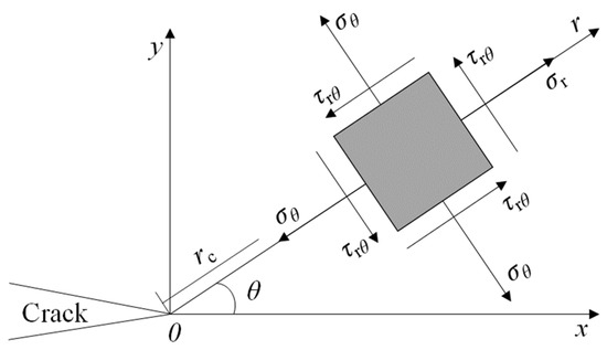 According to the traditional fracture theory, the stress field at the tip of the classical I-II mixed-mode crack is shown in Figure 4. The stress components can be divided into radial stress , circumferential stress , and shear stress .