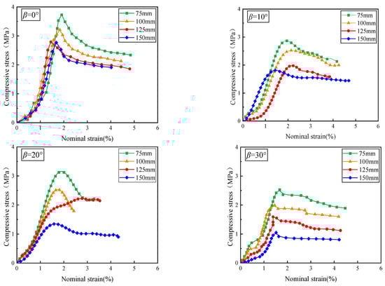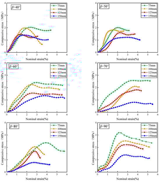 Figure 5 shows the relationship between compressive stress and nominal strain for open crack specimens with varying sizes and crack inclination angles. For a given crack inclination angle, the stress–strain curves of specimens with varying sizes exhibit similar trends. Initially, the specimen is in the compaction stage, and the stress–axial strain curve exhibits nonlinear deformation and shows a slow growth trend. The nonlinear deformation is more pronounced in smaller specimens. This nonlinear behavior is more noticeable in smaller specimens. As the test continues, the strain increases progressively, and the specimens enter the elastic deformation phase, where the stress–strain curve shows a clear linear rise, consistent with standard elastic behavior. Once the peak compressive stress is reached, the prefabricated crack expands rapidly, and the stress–strain curve transitions to nonlinear deformation. As the crack continues to propagate, the specimen experiences failure, its compressive strength decreases, and the compressive stress gradually diminishes, ultimately reaching the strain-softening stage. For a constant crack inclination angle β, the peak compressive stress decreases as the specimen size increases, demonstrating a clear size effect. Taking β = 30° as an example, the peak compressive stresses of 75 mm to 150 mm specimens were 2.530 MPa, 1.990 MPa, 1.590 MPa, and 1.050 MPa, respectively. Compared with that of the 75 mm specimen, the peak compressive stress was reduced by 21.3%, 20.1%, and 33.9%, respectively. These decreases were more pronounced at larger crack inclinations. The peak compressive stress is highest at the crack inclination angle (β) of 0° and 90°. This is because when β = 0°, the crack is parallel to the direction of compressive stress, and only the transverse stress acts on the crack tip, resulting in tensile stress; meanwhile, when β = 90°, the crack surface is perpendicular to the direction of compressive stress, and the crack is only subjected to normal stress, and the sample can withstand greater loads. These observations align with the findings of Wang et al. [18].