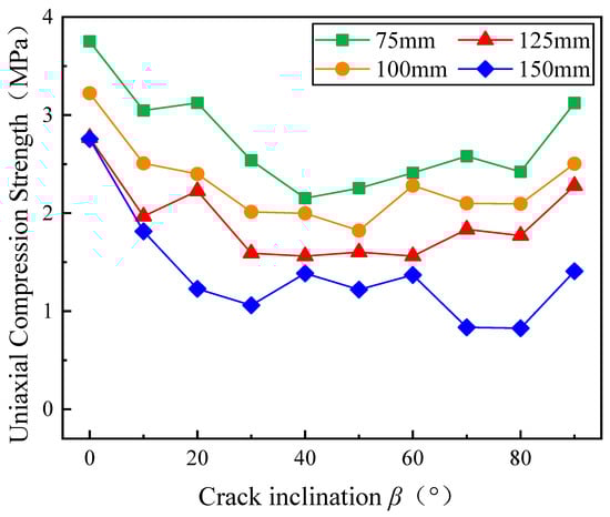 Figure 6 illustrates how compressive strength varies with crack inclination angle for specimens of different sizes. It is clear that the compressive strength of specimens with varying sizes follows a similar trend in relation to β. When β = 0°, the compressive strength is at its highest, with the compressive strength of the 150 mm specimen closely matching that of the 125 mm specimen. As β increases, the compressive strength initially decreases. Within the range β of 20° to 80°, the compressive strength begins to fluctuate gradually, and its continuous rising and falling conclude with a sharp rise at β = 90°. The overall trend is first decreasing and then increasing, which is similar to the results of many previous studies [18,61,62,63]. For a given crack inclination angle β, the compressive strength decreases as specimen size increases. Taking β = 50° as an example, the uniaxial compressive strength of 75 mm to 150 mm specimens were 2.254 MPa, 1.821 MPa, 1.601 MPa, and 1.219 MPa, respectively. The differences between specimens with adjacent sizes were 0.433 MPa, 0.219 MPa, and 0.382 MPa, corresponding to reductions of 19.2%, 12.0%, and 23.9%, respectively, as specimen size increased. When β = 10°, the compressive strength of 75 mm specimen was 3.046 MPa, while that of 150 mm specimen was 1.231 MPa, a difference of 1.895 MPa, corresponding to a 40.4% decrease in compressive strength. This highlights the significant effect that specimen size has on the compressive strength of gypsum specimens.