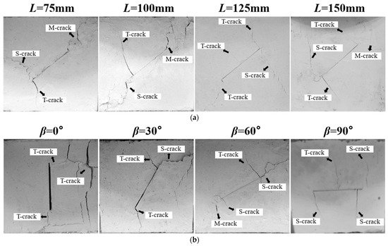 As the test progresses, the prefabricated crack of the specimen will gradually expand into various types of macroscopic cracks as the load increases. Initially, in the early stages of loading, tensile cracks typically form first. As the compressive stress continues to increase, the specimen gradually deforms, and shear cracks, along with mixed-mode cracks, begin to emerge [52,58]. To facilitate crack type analysis, Figure 7 includes annotations: tensile cracks are labeled as T-cracks, shear cracks as S-cracks, and mixed tensile-shear cracks as M-cracks. At the same prefabricated crack inclination (β), the failure characteristics of specimens across different sizes are generally consistent. Thus, the failure process at β = 50° is presented as a representative example, as shown in Figure 7a. The crack propagation paths are notably similar. In the initial loading stage, the small normal stress is insufficient to compact the crack, leaving it open. Due to the normal stress concentration at the crack tip, smooth tensile cracks first appear. As loading progresses, the normal stress increases, the original crack gradually closes, and shear stress becomes active, causing relative sliding along the fracture surface and leading to near-parallel or perpendicular shear cracks at the original crack tip. For specimen sizes L of 75 mm and 100 mm, debris shed from the shear cracks and the expanded cracks became jagged, penetrating the specimen at failure. For specimen sizes L of 125 mm and 150 mm, no debris shedding occurred, and the crack propagation paths became smoother with increasing size. This indicates that smaller specimens experience more severe damage.