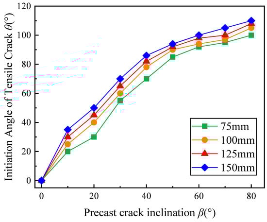 Figure 8 presents the relationship between θ and β for gypsum specimens with open cracks of varying sizes, showing that as β increases, θ of all sizes gradually increases. With β = 60°, the curve for all specimen sizes gradually stabilized. In addition, the θ value of a larger specimen was greater under the same β in the range of 10° to 80°. Taking β = 30° as an example, the θ for specimens of 75 mm to 150 mm were 55°, 60°, 65° and 70°, respectively, indicating that θ was influenced by specimen size to some extent. It should be noticed that with β = 90°, where , no tensile cracks initiation occurred at the crack tip. Thus, this point was eliminated.