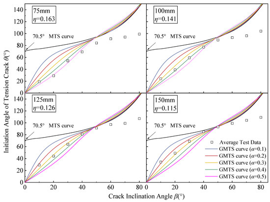 According to Figure 9, θ of specimens with different sizes gradually increased as β increased, while θ predicted by the MTS criterion not considering T-stress was always above 70.5°. With β below 50°, the MTS criterion theoretical values differed significantly from the test values. With the GMTS criterion considering T-stress, the test values became consistent with the GMTS criterion theoretical curves of different α, with a significantly improved degree of consistency in the predicted results. The test values for specimens with a size L of 75 to 150 mm are in the highest agreement with the theoretical curve with the critical size α = 0.5, α = 0.4, α = 0.3, and α = 0.2. Therefore, with increased specimen size, the α value of the GMTS theoretical curve matching the test values gradually decreased, indicating that this criterion can reflect the size differences in the open crack specimens. In the meantime, the theoretical θ increased with the decrease in α at the same specimen size. With β = 50°, the MTS theory and the GMTS theory predict basically the same θ for specimens of all sizes, all around 90°. As β exceeds 50°, the MTS criterion theoretical curves and the GMTS criterion theoretical curves gradually become the same. As β increases, theoretical θ values rise consistently but show a growing deviation from experimental measurements. At the same specimen size, the theoretical θ increases as α decreases, unlike the cases with β below 50°. It is important to highlight that the theoretical θ is calculated to be 180° when β is 90°, which is a digital limit value that will not appear in actual situations. Hence, it was eliminated from the comparative analysis.