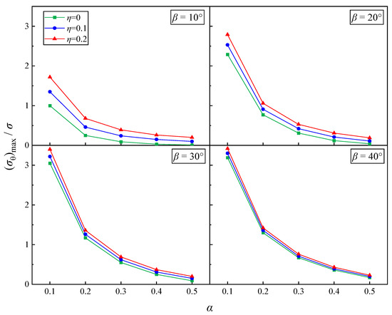 Figure 10 shows the variation in the maximum circumferential stress with α for three different passivation coefficients η. The maximum circumferential stress was analyzed in a dimensionless manner. The analysis covers inclination angles β = 10°, 20°, 30°, and 40°, with η = 0, 0.1, and 0.2. From the figure, it is apparent that both for mathematical cracks and open cracks, decreases as α increases for different β. This indicates that, for the same β, larger specimens experience greater circumferential stress under compressive-shear stress, resulting in lower stress requirements for crack failure. Additionally, at a fixed α, specimens with a higher η exhibit larger , indicating that the degree of crack opening also influences the cracking stress. As β increases, gradually increases, and the values for different η approach each other. This behavior can be attributed to the growing normal stress acting on the crack as β increases. In practical experiments, as loading continues, the cracks gradually close, and shear stress becomes the dominant factor controlling crack tip failure.