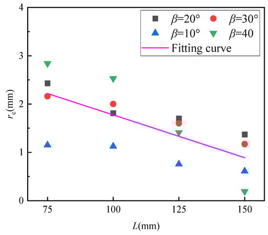 The following steps were performed to better analyze the fracture process zone (FPZ), also known as the critical crack tip size (rc), First, four typical angles (β = 10°, β = 20°, β = 30°, and β = 40°) were chosen. These angles were selected from a range where the theoretical predictions and experimental measurements align closely, specifically β < 50°. The matching relative critical size α was estimated based on the test values in Figure 9. The value of rc was then calculated using Equation , as shown in Table 2. The results indicate that rc is notably influenced by the specimen size. This finding contrasts with previous studies, which treated rc as an inherent material property [65]. As shown in Figure 11, a plot was created to illustrate the relationship between rc and specimen size for different β, and a linear relationship between rc and L was fitted: (R2 = 0.45622). It was observed that rc decreases as specimen size increases, a trend that aligns with the results reported by Wang et al. [18]. This size-dependent behavior of rc can be understood from an energy perspective. The FPZ serves as an energy-absorbing region, and this area in quasi-brittle materials is filled with microcracks. The applied stress at the crack tip is primarily converted into two forms of energy: the elastic strain energy of the specimen and the energy necessary to develop the fracture process zone (FPZ). Therefore, a certain load is required to fully form the FPZ. An increase in the length of the FPZ suggests a greater capacity for the crack tip region to absorb and store energy, leading to a size effect. Larger quasi-brittle material specimens have a smaller FPZ that can absorb less energy, making them more prone to failure.