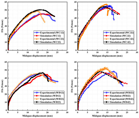Comparison of the load–midspan displacement curves between the experimental and simulation results.