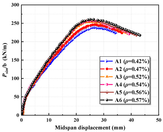 The results from the finite element simulations are illustrated in Figure 4. The load comparison is represented as the load divided by the width (Psim/b). It is observed that, as the longitudinal reinforcement ratio increases, the stiffness of the slab significantly improves, and its load-bearing capacity increases. Meanwhile, the deflection corresponding to the ultimate load progressively decreases. By increasing the longitudinal steel-strand reinforcement ratio, the tensile force within the tension zone within the slab increases for the same curvature. This change causes the resultant force point of the cross-section to shift downward to maintain equilibrium, while the ultimate compressive strain of the ECC remains constant, resulting in reduced deflection at the ultimate load. During the finite element simulations, the ultimate compressive strength of the ECC can be determined by identifying when the maximum damage factor in the compressed region of the ECC reaches its limit, as illustrated in Figure 5. The maximum reinforcement ratio of the slab is confirmed by assessing whether the stress state of the longitudinal steel strands attains the nominal yield state. In the finite element simulation of Group A slabs, the stress of the steel strands was recorded at the moment the ECC reached its ultimate compressive strength, as depicted in Figure 5.