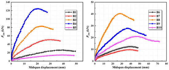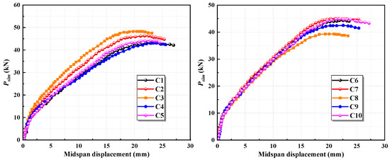 The comparison of the simulated results with the experimental load–midspan displacement curves for each specimen is presented in Figure 3. Additionally, Table 3 includes the numerical values of the ultimate loads along with their corresponding error values. The simulated ultimate loads closely align with the experimental values, yielding an average error of 4.60% and a maximum error of only 8.99%. Notably, the ascending branch of the finite element simulation curves closely corresponds to the ascending branch of the experimental curves, further validating the accuracy of the established model.
