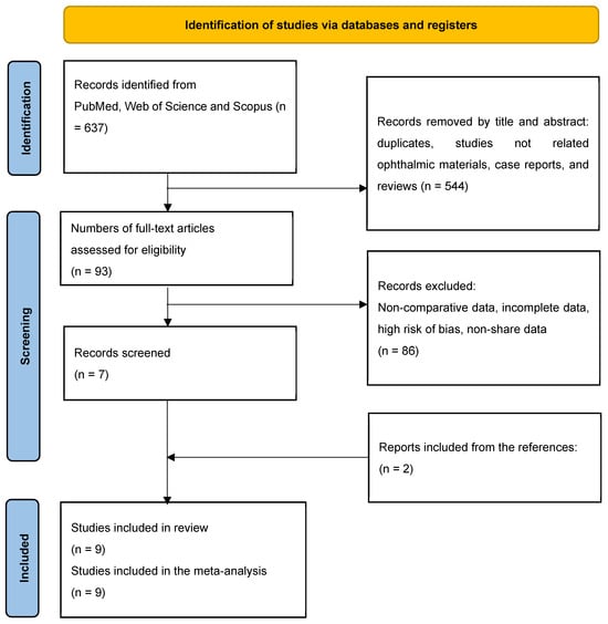 The initial search identified 637 articles (Figure 1). After removing duplicates, 54 studies were excluded, which included those not focused on ophthalmic lens materials or treatments, as well as case reports and review articles identified through title and abstract screening. This left 93 articles for further evaluation.