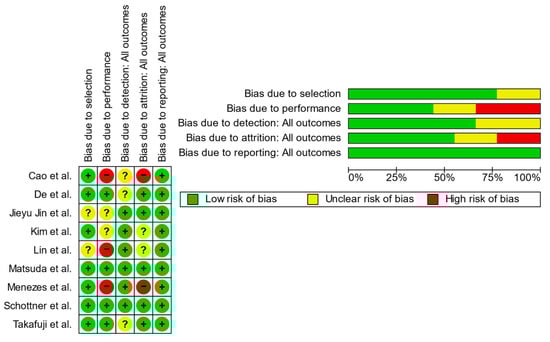 Risk of bias assessment (green = low risk; red = high risk; yellow = unknown) [4,5,6,8,10,14,17,18,19].