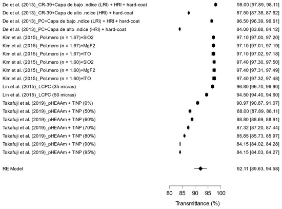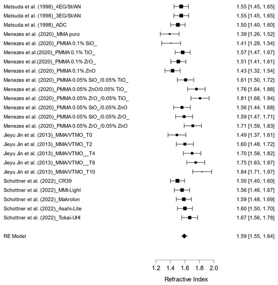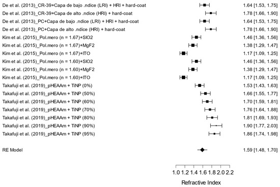 The pooled results concerning the refractive index of various treatments applied to optical lenses are presented in Figure 6. A total of 18 treatments were analyzed, encompassing combinations of polymeric materials and specific coatings, including both high- and low-index layers, hybrid materials, and polymer combinations with varying proportions of titanium dioxide nanoparticles (TiNPs).