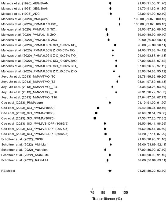 A meta-regression analysis was conducted to evaluate the influence of refractive index and transmittance on effect size (Figure 8). The results showed that the refractive index had a positive and significant impact (coefficient = 0.6201; 95% CI: 0.527 to 0.713; p < 0.001), while transmittance was not statistically significant (coefficient = −0.0008; 95% CI: −0.005 to 0.003; p = 0.648). The model explained 98.1% of the variability in effect size (R2 = 0.981), highlighting the relevance of the refractive index as a key factor in the optical performance of the evaluated materials.
