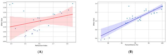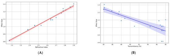 (A) Effect size vs. refractive index in studies on treatments for ophthalmic lenses; (B) effect size vs. transmittance (%) in studies on treatments for ophthalmic lenses.
