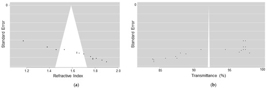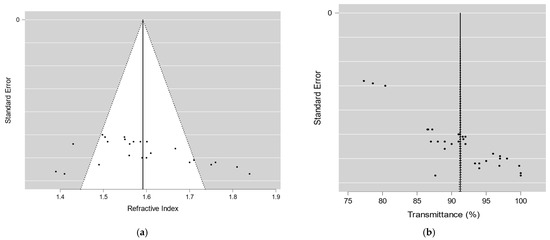 The funnel plots in Figure 10 indicate the potential presence of publication bias in the studies on lens treatments. For the refractive index, the plot displays an asymmetric distribution around the effect line, which may suggest publication bias, although this asymmetry could also result from study heterogeneity. In contrast, the funnel plot for transmittance reveals a wider spread at the extremes, further suggesting the possibility of bias.