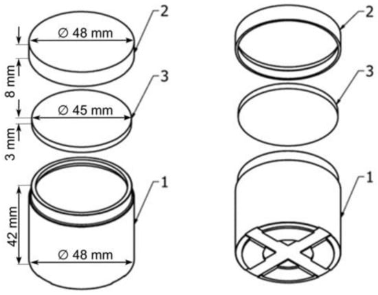 The subject of this research was a container for transporting loose samples (patent no.: 242114) [23], shown in Figure 1. The container was made of high-quality stainless steel, which reduces the impact of chemical and physical factors on its operational parameters and prevents corrosion. Each lid was individually adapted to a given container. There are identifying numbers on both the body and the lid. An additional measure for ensuring the tightness of the container is a silicone gasket, resistant to high temperatures, placed in the lid. By screwing the lid onto the body, the gasket provides an airtight sample storage environment. Due to the use of the container in gravimetric tests—the main element of which is drying the material in an open container—after placing the lid under the body, special grooves were cut on the bottom of the container; these enable evaporation of the water extracted from the sample that condenses on the lid, allowing real weight loss results to be obtained.