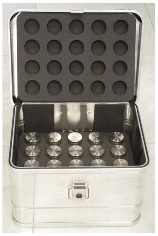 Acting in accordance with the guidelines of the organization accrediting research laboratories and in order to meet the requirements of the EN ISO 12570 standard [18], a container for transporting bulk samples was developed and manufactured (patent no.: 242114) [23]. Containers numbered 0001 to 0118 were tested to confirm their tightness and usability for gravimetric tests.
