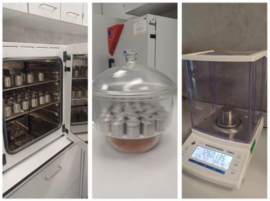 Analyses of the evaporation of water—that could condense during the transport of the sample in a closed container from the lid, which was unscrewed and placed under the container during the drying process—were carried out in accordance with the EN ISO 12570 standard [18]. For mass measurements, a calibrated HT224RCEN scale (VIBRA SHINKO DENSHI CO., Tokyo, Japan) was used, with a measurement accuracy of up to 0.0001 g. In order to reproduce the most unfavourable conditions for transporting samples from the collection site to the laboratory (temperature of approx. 50 °C), a FED56 dryer was applied (BINDER GmbH, Tuttlingen, Germany). The dryer was also used to dry samples and containers to a constant mass, taking into account the mass of the body and cap separately. A desiccator filled with silica gel was also used for testing. The laboratory set-up for determining the drying efficiency of the container in which the samples were transported is shown in Figure 4.