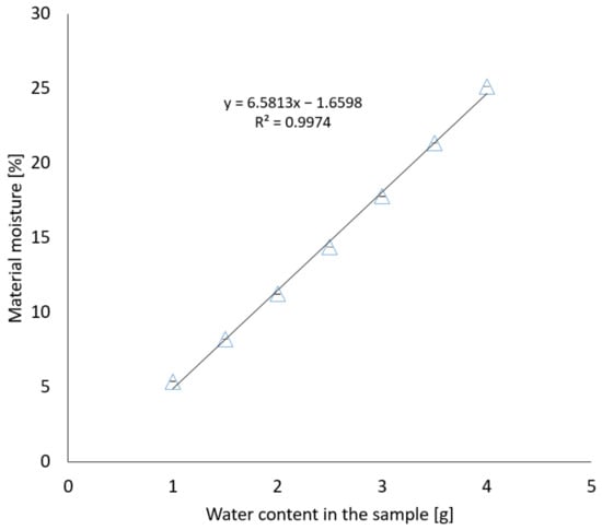 The mass moisture of the samples after testing in accordance with the EN ISO 12570 standard [18] and taking into account the accuracy of the method is consistent with that assumed in Table 1. The variability of the material moisture in relation to the applied water is linear, and the value of the determination coefficient R2 is over 99%, which indicates a good fit of the linear model to the examined relationship.