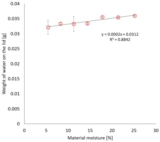 Additionally, it was tested whether the design of the container allows for effective drying and provides reliable results of the moisture content of the bulk material. When reproducing the sample transport conditions at 50 °C in a closed container, water extracted from the building material condensed on the lid in small amounts compared to the total moisture of the sample. At a material moisture of 5.4%, the mass of water on the lid was on average 0.032 g. As the sample moisture increased, the amount of water on the lid increased to a maximum level of 0.036 g in the case of a maximally saturated sample, as shown in Figure 6 Similarly to the previous case, the tested relationship is linear and is characterised by a relatively high value of the coefficient of determination R2, greater than 88%.