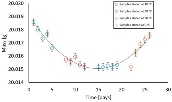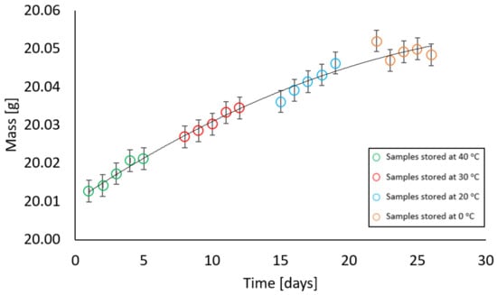Samples with zero moisture gradually increased their mass throughout the entire period of stay in the climatic chamber at 85% relative humidity at the following temperature sequence: 40 °C, 30 °C, 20 °C, and 0 °C. The test results are presented in Figure 8. It was observed that the mass increase after 5 days at 40 °C was 0.0085 g, and after 26 days it was 0.0357 g. The maximum increase was 0.2% of the total initial mass of the sample.