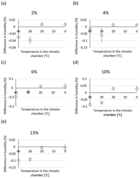 Dependence of the difference in moisture on the temperature at which a sample with given moisture parameters was stored. (a) samples with 2% mass moisture content, (b) samples with 4% mass moisture content, (c) samples with 6% mass moisture content, (d) samples with 10% mass moisture content, (e) samples with 13% mass moisture content.