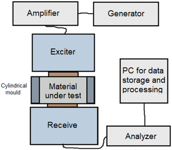 The principle of the pass-through pulsed ultrasonic method is the passage of mechanical waves through the material during hydration. When a fresh mixture solidifies or hardens, the properties of the signal passing between two piezoelectric transducers change, where the first transducer acts as an exciter and the second as a receiver of the signal. The circuit diagram of the pass-through pulsed ultrasonic method is shown in Figure 1.