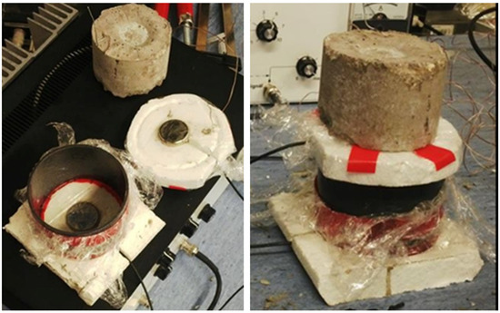 The receiving piezoelectric sensor was then mounted in a polystyrene template in the prepared mould. This template forms the base of the cylindrical mould. A thin layer of de-moulding agent was applied to the sensing surface, and then the mould and the polystyrene base were seated on top of this. All air pockets were manually removed during the settling process. Air pockets could affect the received signal. Air pockets can form between the sensing surface and the foil at the bottom of the mould (see Figure 2—left). A thin layer of de-moulding agent was applied to the sensing surface and then covered with foil to again prevent water from reaching the piezoelectric element. The de-moulding agent in a thin layer allows for better acoustic coupling. A prepared temperature sensor was also attached to the polystyrene lid for future measurement of the internal temperature of the hydrating material.