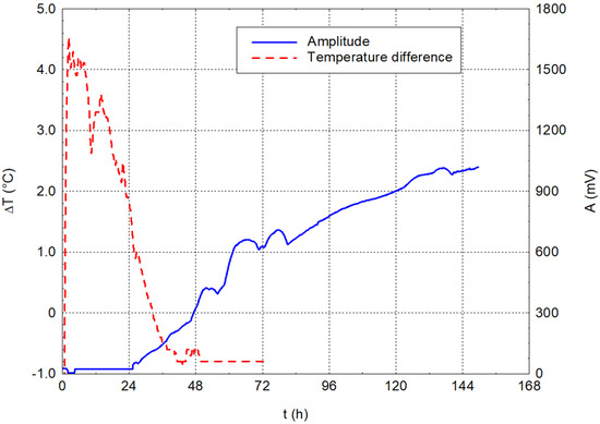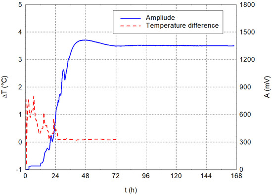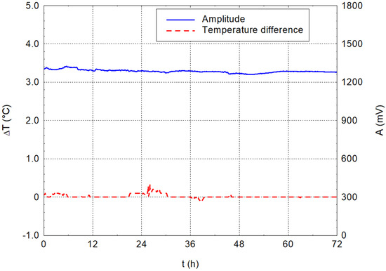 Figure 4 and Figure 5 show the results of the measurements of ordinary tap water alone. The graphs show that no significant changes occurred throughout 72 h. The amplitude stabilised around 1.29 V during the measurements, and the difference in water temperature relative to the ambient temperature stayed close to zero. This first experiment verified the stability of the amplitude and temperature values over time on the water alone.