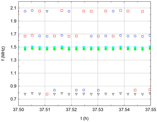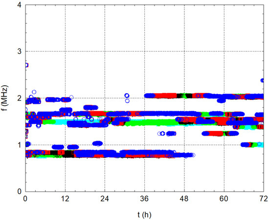 The situation is a little different in the frequency analysis results. There are dominant frequencies in three significant packages (Figure 5 and detailed on Figure 6). Five dominant frequencies were observed, with each colour representing one of the five dominant frequencies. During the measurement, a signal was recorded every 10 s, and, from this, the five dominant frequencies were determined using FFT and plotted on a graph. From these points, significant frequency lines emerged in the graph, producing packages of significant frequencies over time. The first considerable package, especially at the beginning of the measurement, is the frequencies near 850 kHz (the resonant frequencies of the transducer and exciter). The second more significant package is frequencies around 1.5 MHz, which occur throughout the measurement period and are probably related to the water. The third package, associated with the first package, is frequencies around the value of 2 MHz. The shift of the frequencies from 850 kHz to approximately 2 MHz is probably related to the combination of the Doppler effect and interference. Neither the transmitter nor the receiver moves mutually, but, owing to wave folding, the waves resulting from interference and reflections meet after approximately 36 h of measurements. Thus, new wave sources are created in the vessel with the water itself, which affects the frequency of the received waves; thus, the frequency shifts from 850 kHz to 2 MHz.