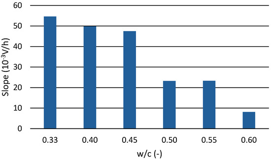 In Figure 9, the slope values are plotted against the water coefficient. The differences between the different cement pastes are more prominent. The bar graph shows two groups of cement pastes: one group consists of cement pastes with water coefficients of 0.33, 0.40, and 0.45, and the other group consists of cement pastes with water coefficients of 0.50, 0.55, and 0.60.